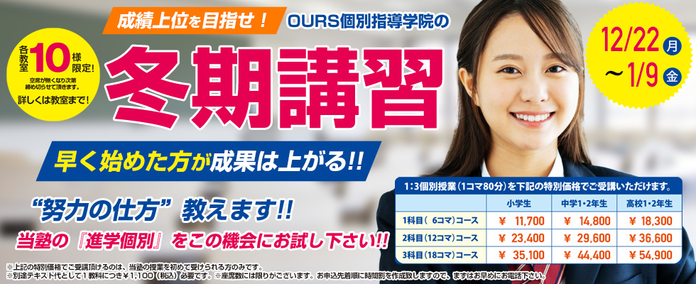 トップ > ニュースリリース > 冬期講習 お申込受付開始! ニュースリリース 冬期講習 お申込受付開始! 2025年11月04日更新 冬期講習の受講予約を本日から承ります。 初めての方は、下記の特別料金(通常料金の3割引)で当塾の冬期講習をご受講頂けます。 ※画像には教材費別途¥1,100とありますが、表記している料金は全て「教材費込み」の料金です。 この機会にぜひ当塾の個別指導をお試しください。 メニュー トップページ 授業料・時間割 方針・合格実績 各教室紹介 会社概要 よくある質問 教室長紹介&ブログ 採用情報 お問い合わせ 会社情報 OURS個別指導学院 〒520-2331滋賀県野洲市小篠原1173-3 TEL:077-599-3986 FAX:077-599-3987